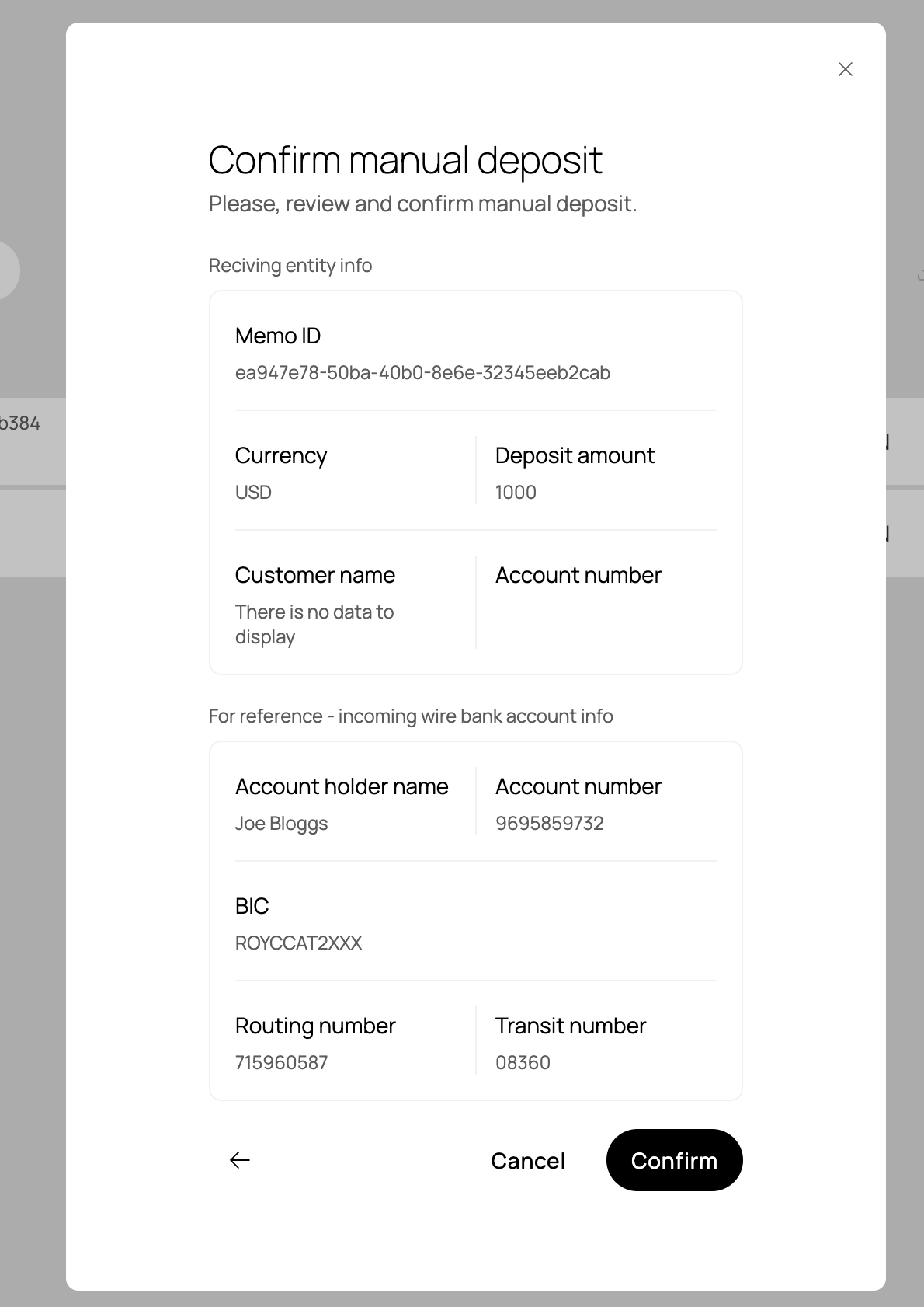 }'You will get back the following response with the fiat deposit instructions that you can supply to your customers. Once the fiat funds are deposited, the customer account will be credited.