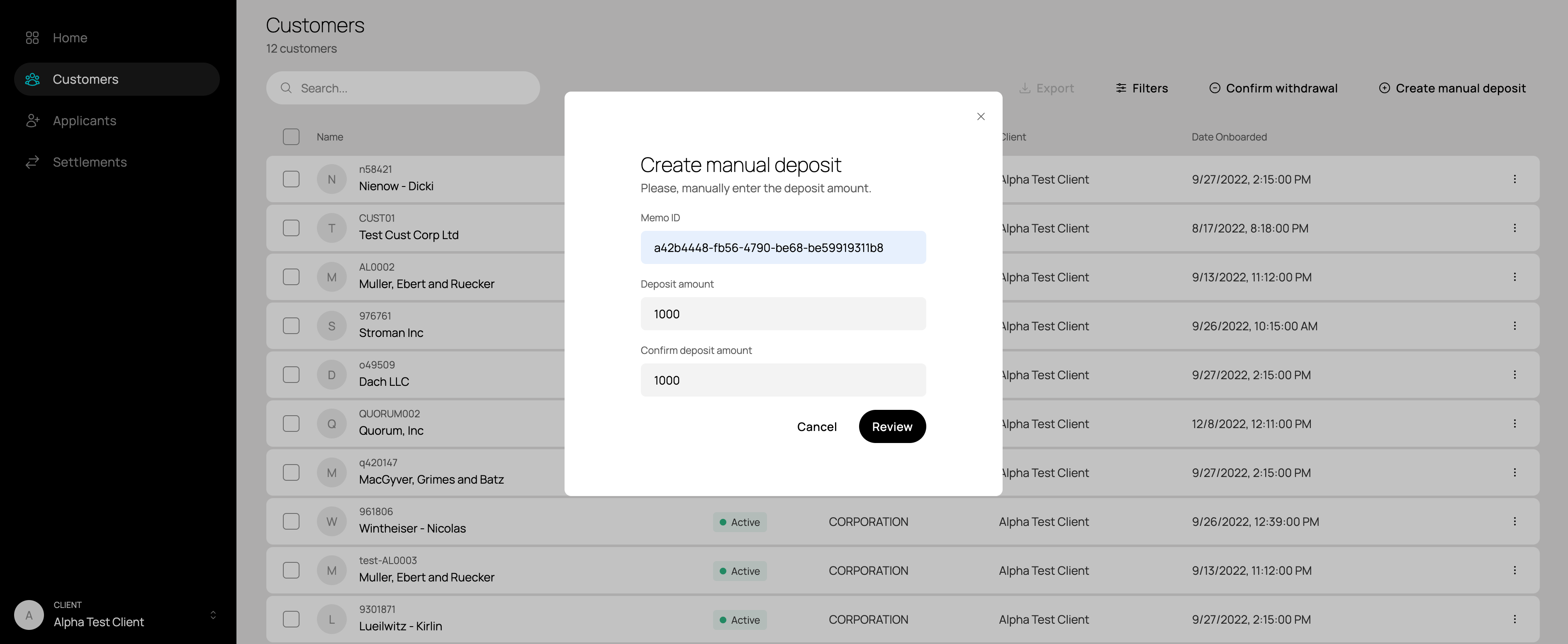 Enter one of the memo entries from the above response object and 1000 as the amount you want to deposit.