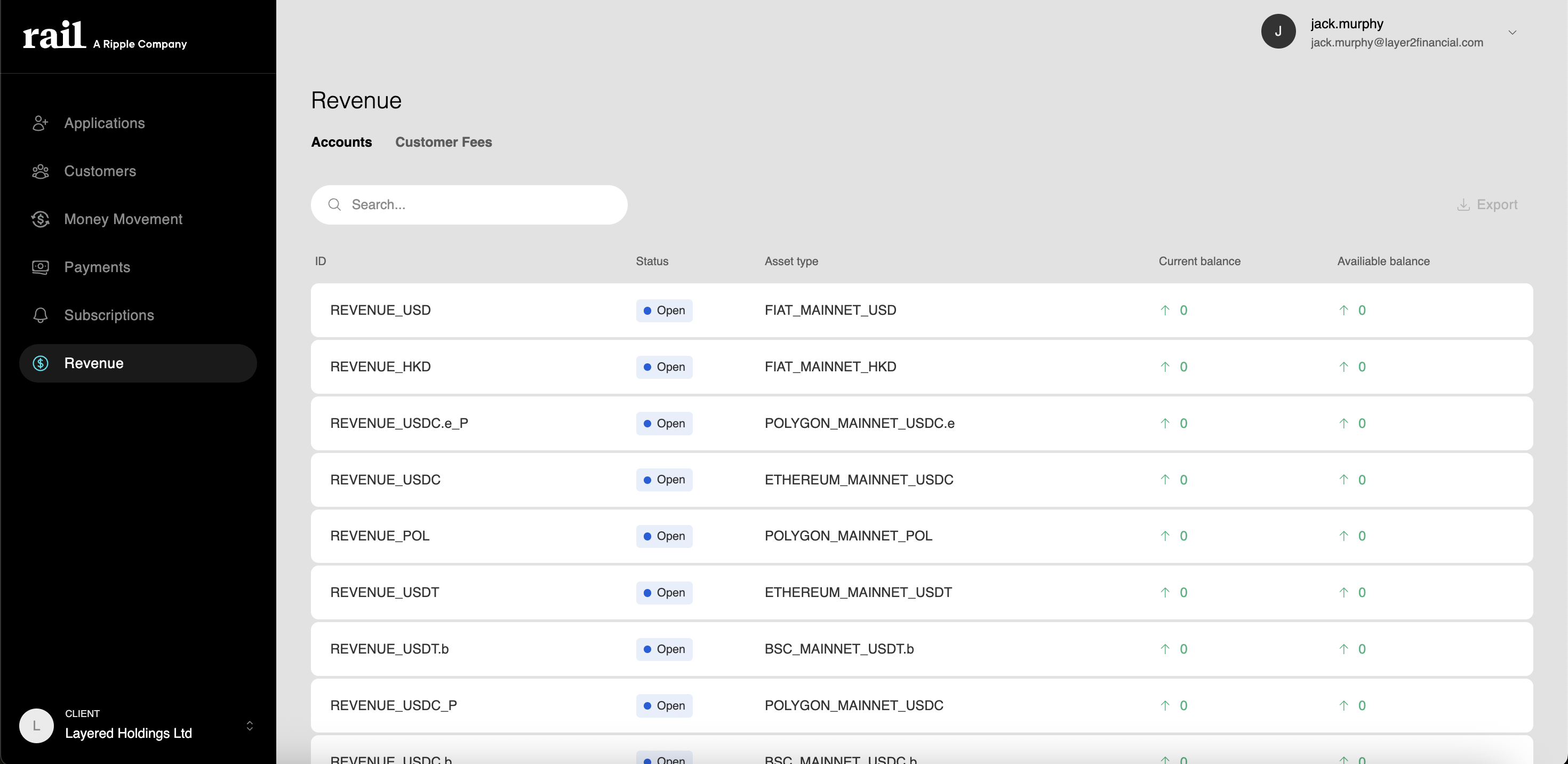 The Revenue section in the Management UI allows you to configure developer fees and manage the accounts where those fees are collected. Developer fees enable you to collect additional fees from your end customers when they perform transactions on your platform.