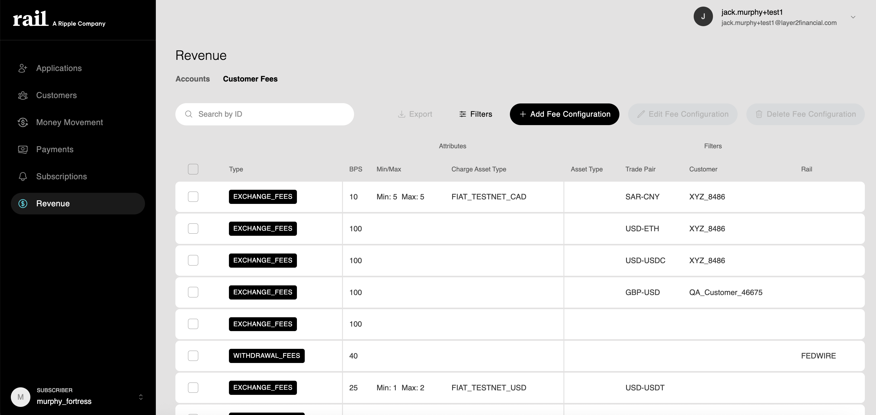- Precedence determines which fee applies when multiple match (Rail > Customer > Trade Pair > Asset Type)